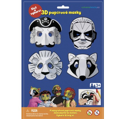 Papírové karnevalové masky - 4 ks - pirát, superhrdina, lev, mýval. Předvyražené masky slož podle obrázkového návodu a vymaluj si. Sada obsahuje 4 různé masky, gumičku, obrázkový návod. Barvy nejsou součástí balení. Masky jsou vyrobeny na kvalitním tvrdém papíru.