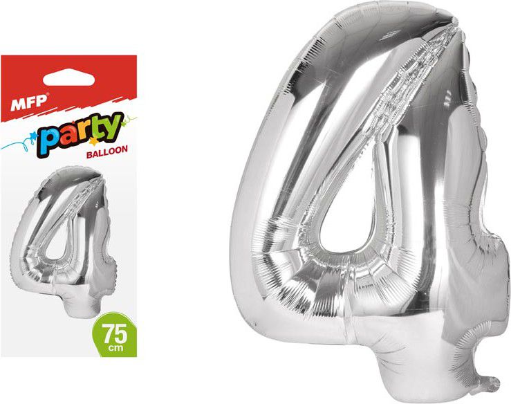 Nafukovací fóliový balónek ve tvaru čísla 4 - Hitem posledních let jsou oblíbené balónky ve tvaru číslic, které oživí celou narozeninovou oslavu a zajisté potěší oslavence. Narozeninová oslava může začít! Balónek je vyroben ze stříbrné fólie. Na horní straně balónku jsou očka na přivázání. Výška balónku: 75 cm