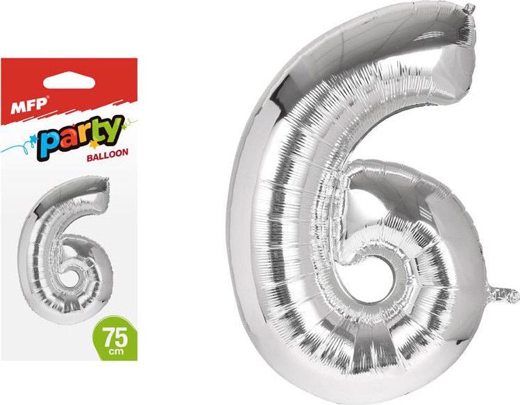 Nafukovací fóliový balónek ve tvaru čísla 6 - Hitem posledních let jsou oblíbené balónky ve tvaru číslic, které oživí celou narozeninovou oslavu a zajisté potěší oslavence. Narozeninová oslava může začít! Balónek je vyroben ze stříbrné fólie. Na horní straně balónku jsou očka na přivázání. Výška balónku: 75 cm