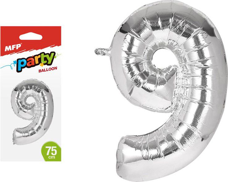 Nafukovací fóliový balónek ve tvaru čísla 9 - Hitem posledních let jsou oblíbené balónky ve tvaru číslic, které oživí celou narozeninovou oslavu a zajisté potěší oslavence. Narozeninová oslava může začít! Balónek je vyroben ze stříbrné fólie. Na horní straně balónku jsou očka na přivázání. Výška balónku: 75 cm