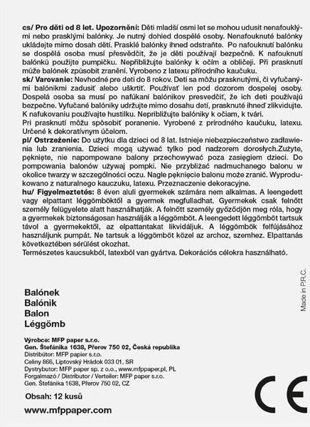 - VAROVÁNÍ: Vhodné pro děti od 8 let. Děti se mohou prasklými či vyfouknutými balónky zadusit nebo uškrtit. Používejte pouze pod dozorem dospělé osoby. Dospělá osoba se po nafouknutí balónku musí přesvědčit, že jej děti používají bezpečně. Vyfouklé balónky udržujte mimo dosah dětí a prasklé ihned zlikvidujte. K nafukování balónků použíjte pumpičku. Nepřibližujte balónky k očím a obličeji. Při prasknutí může balónek způsobit zranění.