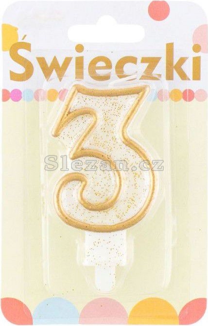 Svíčka narozeninová - číslice 3 - zlacená s glitry Rozměr: 7,5cm Karton: 5ks Cena je uvedena za 1 kus.