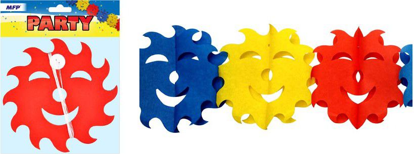 Papírová girlanda od společnosti MFP paper v různobarevném provedení s motivem slunce - Girlandy jsou oblíbeným doplňkem pro výzdobu místností. Touto girlandou nezkazíte dekoraci na žádné party, ať už se bude jednat o narozeninovou párty pro děti nebo pro dospělé. Zaručeně upoutá pozornost všech zúčastněných. POUŽITÍ: Barevné motivy jsou spojeny šňůrkou. Zavěste je za oba konce přes místnost dle Vaší libosti. Délka: 4 m Uvedená cena je za 1 ks. Dodáváme v sáčku se závěsem.