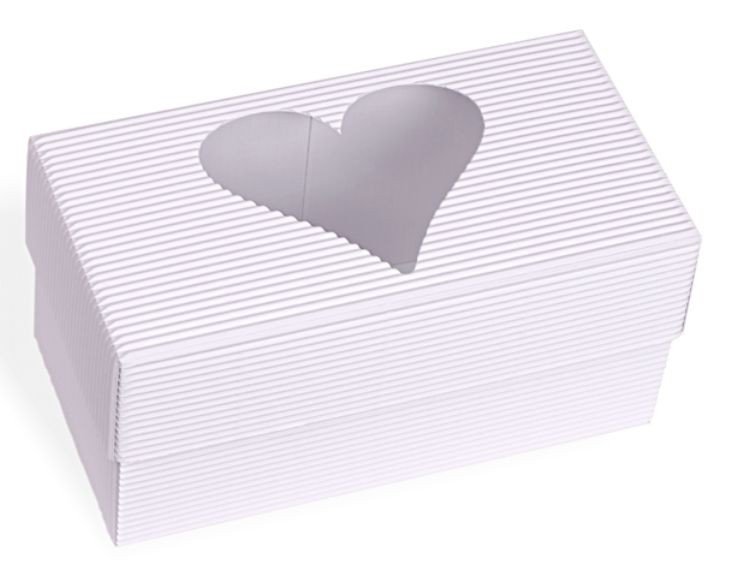 Dárková krabička dno + víko z bílé kraftové dvouvrstvé vlnité lepenky se zafóliovaným okénkem.