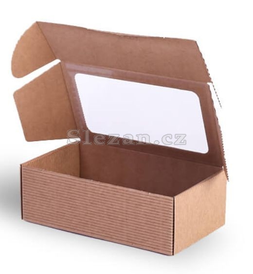 Dárková krabička jednodílná z dvouvrstvé vlnité lepenky se zafóliovaným okénkem.