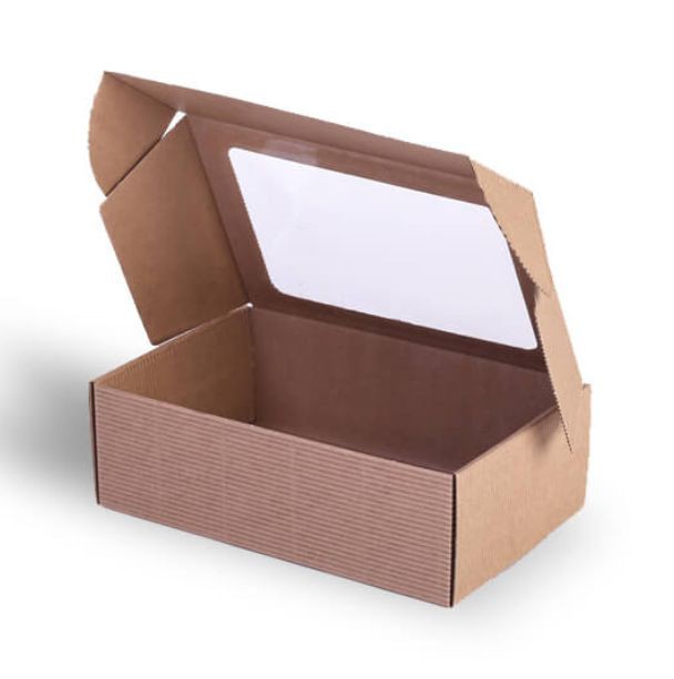 Jednodílná dekorativní dárková krabička z dvouvrstvé vlnité lepenky, okénko opatřeno folií.