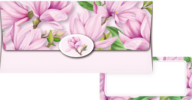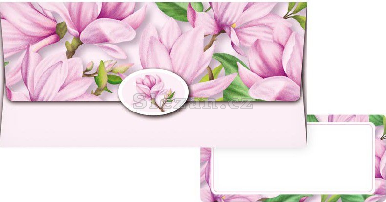 Obálka na peníze s romantickým motivem květů magnólie v jemné růžové barvě je ideální volbou pro darování finančního obnosu na zvláštní příležitosti, jako jsou svatby, narozeniny nebo výročí.