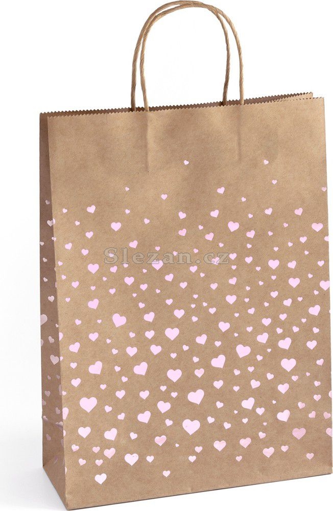 taška z kraftového papíru s ozdobnými růžovými srdíčky v metalickém provedení