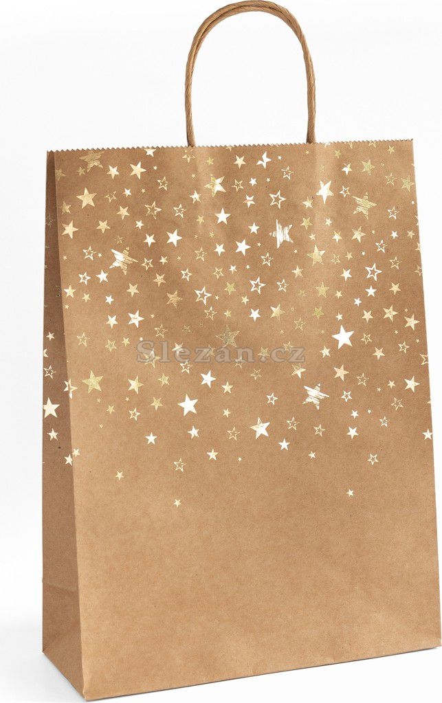 taška z kraftového papíru s ozdobnými zlatými hvězdičkami