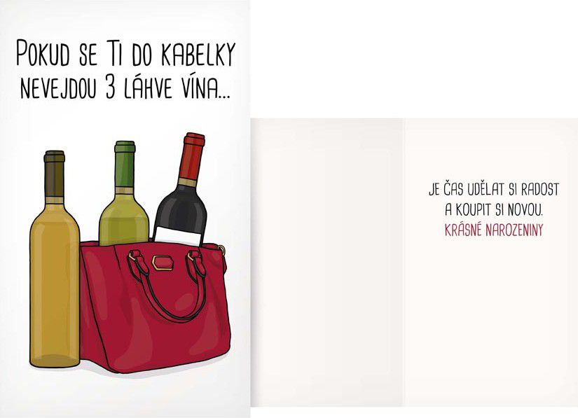 Přání je s motivem kabelky a lahví vína.