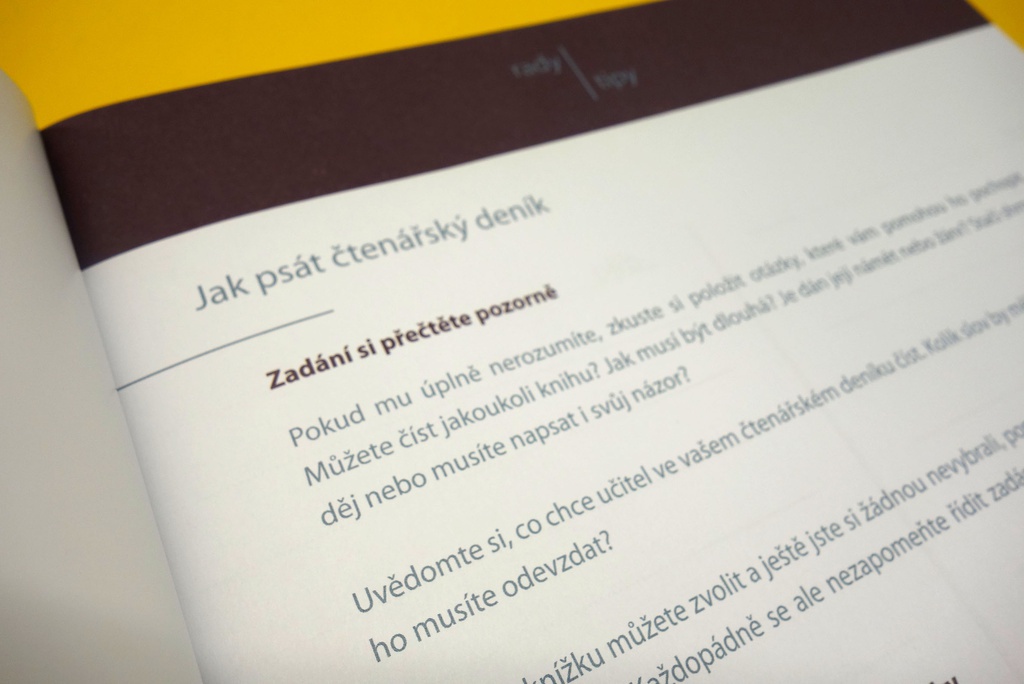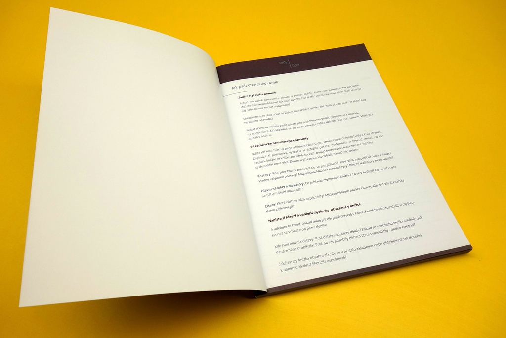 Čtenářský deník pro střední školy, 2 barevné varianty obálky (fialová, modrošedá), formát A4, vnitřní listy: 80 g bezdřevý ofsetový papír, speciální lineatura