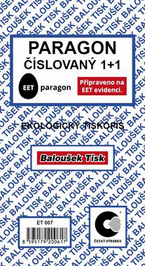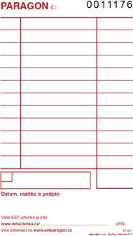 Nepropisující tiskopis. Je přizpůsoben pro EET evidenci. Číslovaný. Vyrobeno z recyklovaného papíru, vnitřní listy s červeným tiskem. Lepený blok.