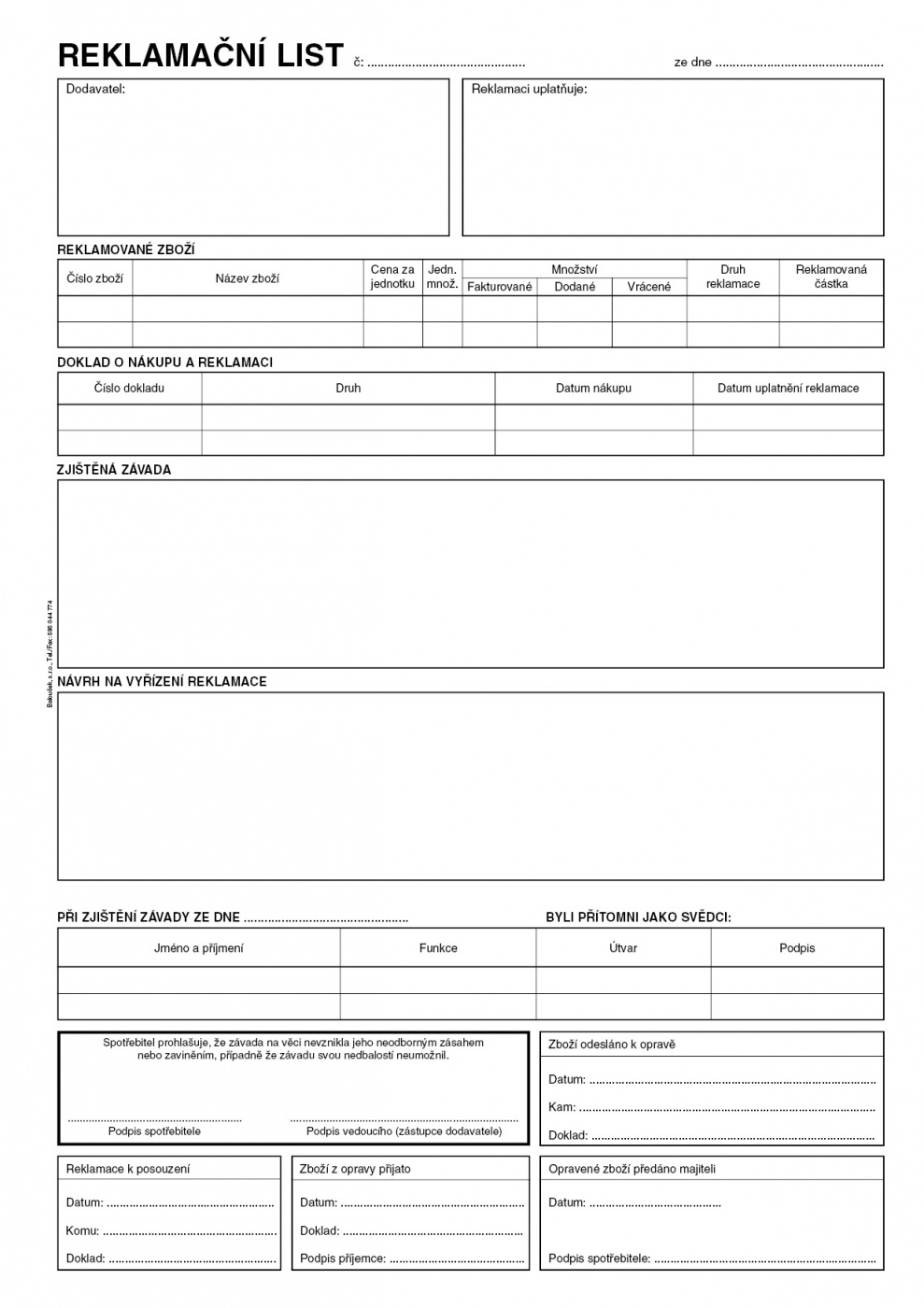Reklamační list A4. Samopropisovací, 50 listů.