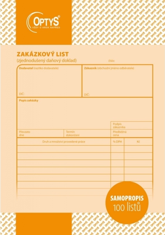 Popis Zakázkový list A5 propisující Optys 1085-100 listů
