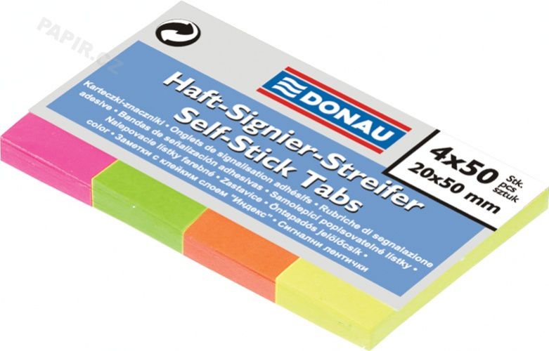Záložky papírové, 4 neonové barvy. 4x50 ks z každé barvy. Rozměr 20 x 50 mm. Samolepící.