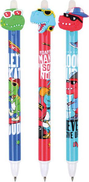 Gumovací kuličkové pero s motivy dinosaurů obsahuje speciální inkoust tzv. vymaž a přepiš, nebo vymaž a nech znovu objevit.