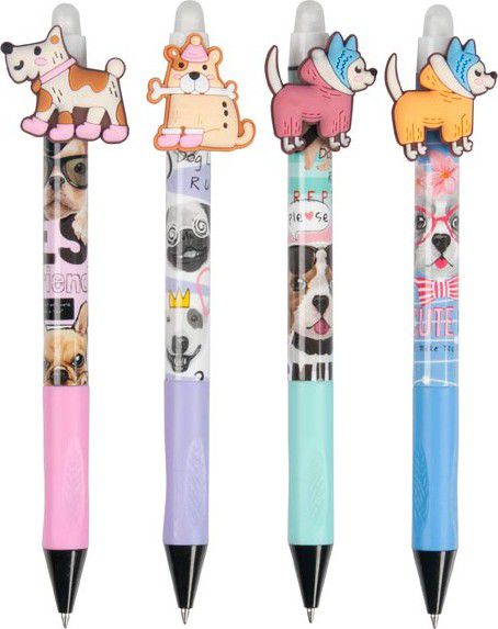 Gumovací kuličkové pero Funny Dogs si zamilujete na první pohled – nejen kvůli barevnému tělu s veselým psím potiskem, ale hlavně díky 3D figurce pejska, která zdobí horní část pera.