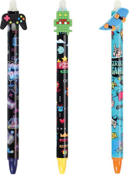 Gumovací gelové kuličkové pero s motivem skateboardu, gamepadu obsahuje speciální inkoust tzv. vymaž a přepiš, nebo vymaž a nech znovu objevit.
