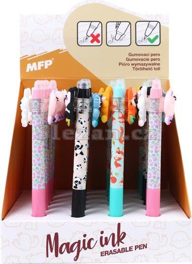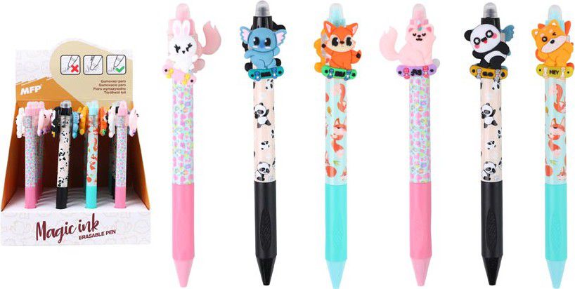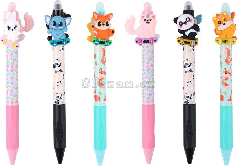 Gumovací kuličkové pero s motivy roztomilých zvířátek. Pero má jemný hrot o tloušťce 0,5 mm a speciální inkoust, který lze snadno vymazat pomocí integrované gumy na konci.