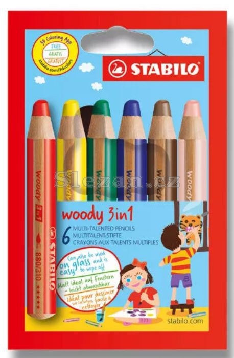 STABILO woody 3 v 1 je pastelka, vodovka a voskovka v jednom, která umí kreslit na papír, na tmavý podklad, karton, sklo, kov, dřevo nebo třeba i na holínky. Ozdobit si dřevěný rámeček, okno, chlebník nebo plechovku na tužky je hračka. Děti ji milují a rodiče mohou zůstat v klidu, protože barvu lze z ručiček i z hladkého povrchu dobře smýt vodou s mýdlem či saponátem. Tuha obsahuje osmkrát více barvy než běžná pastelka, nelze ji zlomit a hodí se na extra dloooooouhé kreslení a na velká umělecká díla: silná tuha vše rychle vybarví. Díky svému tvaru padne woody výborně do dětské ručičky. Nelámavá XXL tuha o průměru 10 mm se postará o perfektní vybarvení velkých ploch a téměř všechny techniky kreslení, je extra odolná a tak vydrží i v tom nejdivočejším dětském pokoji