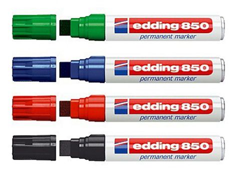 Permanentní popisovač Edding 850 se seříznutým hrotem, šíře stopy: 5 - 16 mm, obsahuje inkoust se slabým zápachem.