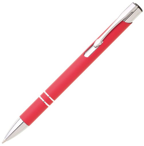 Hliníková propiska se stříbrnými doplňky a měkkým pogumovaným soft povrchem.