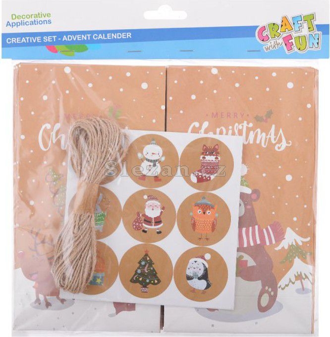 Balení obsahuje: 24ks papírových sáčků s vánočním motivem, samolepky s vánočním motivem, jutový provázek.