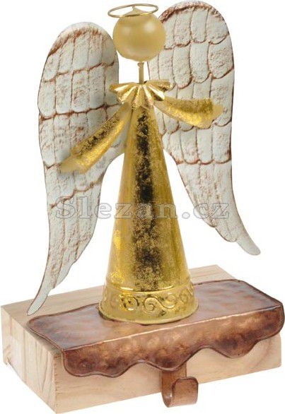 Plechový anděl má zlatou barvu a dřevěný podstavec s háčkem.