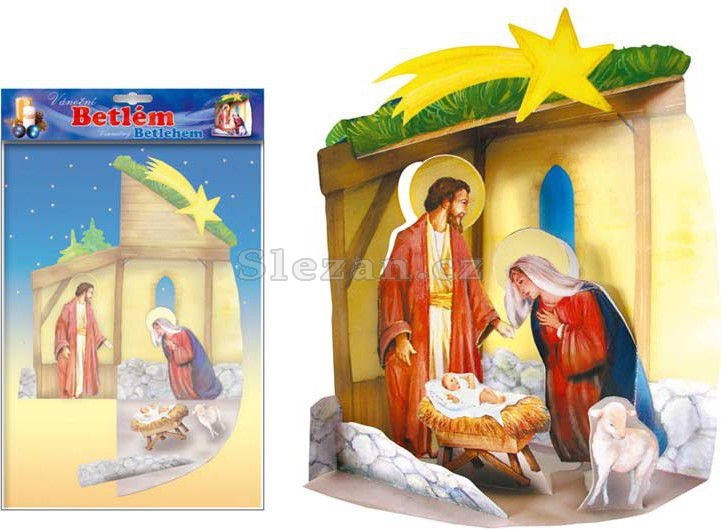 Skládací betlém barevný s glitrem. Poskládejte si papírový betlém s Josefem, Marií a malým Ježíškem v jesličkách. Sestavení je velice jednoduché a nepotřebujete k němu žádné nástroje. Betlém má glitry a lze ho velice lehce rozložit a zase uschovat. Dodáváme v sáčku se závěsem. Uvedená cena je za 1 ks.