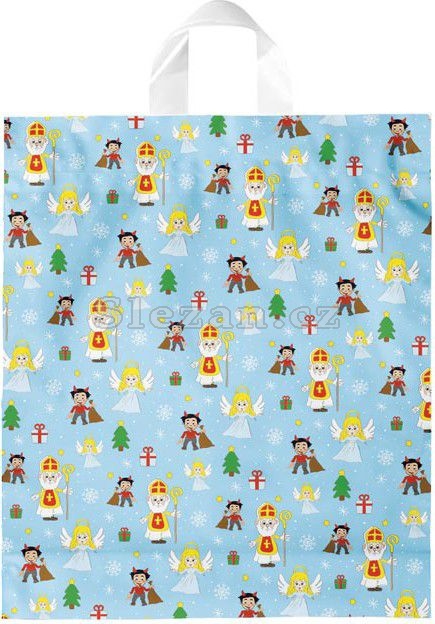 Celoplošně potištěná igelitová taška s Mikulášským motivem a navařeným uchem. Na tašce jsou obrázky Mikuláše, anděla, čerta a vánočních dárků.