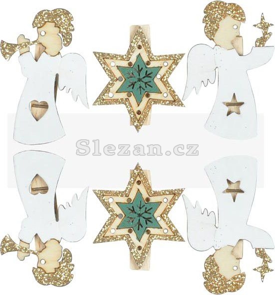BALENÍ OBSAHUJE: 6 ks kolíčků (2 ks andělů s trumpetou, 2 ks vloček, 2 ks andělů s hvězdou)