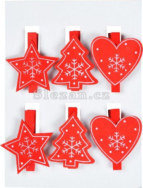 BALENÍ OBSAHUJE: 6 ks kolíčků (2 ks srdíček, 2 ks stromečků, 2 ks hvězdiček)