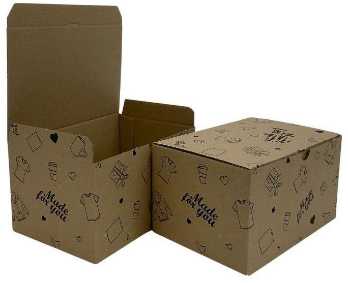 Jednodílná dárková krabička z hnědé třívrstvé vlnité lepenky s jemným černým potiskem po celé vnější ploše.
