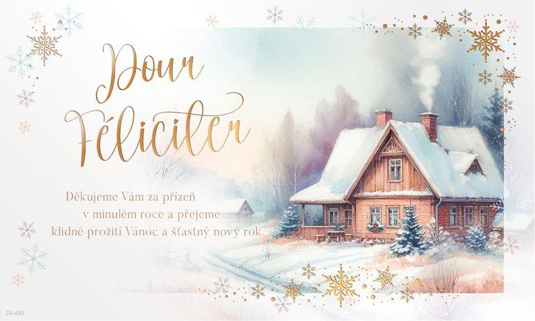 Novoroční přání neboli PF. Nezapomeňte popřát přátelům, kolegům nebo rodině do nového roku. Zajisté je potěší, že jste si na ně vzpomněli. Text na přední straně přání: Pour Féliciter Děkujeme Vám za přízeň v minulém roce a přejeme klidné prožití Vánoc a šťastny nový rok. Text uvnitř přání: Bez textu Papír: pohlednicový karton Přání je baleno v sáčku, součástí je i dopisní obálka. Uvedená cena je za 1 ks.