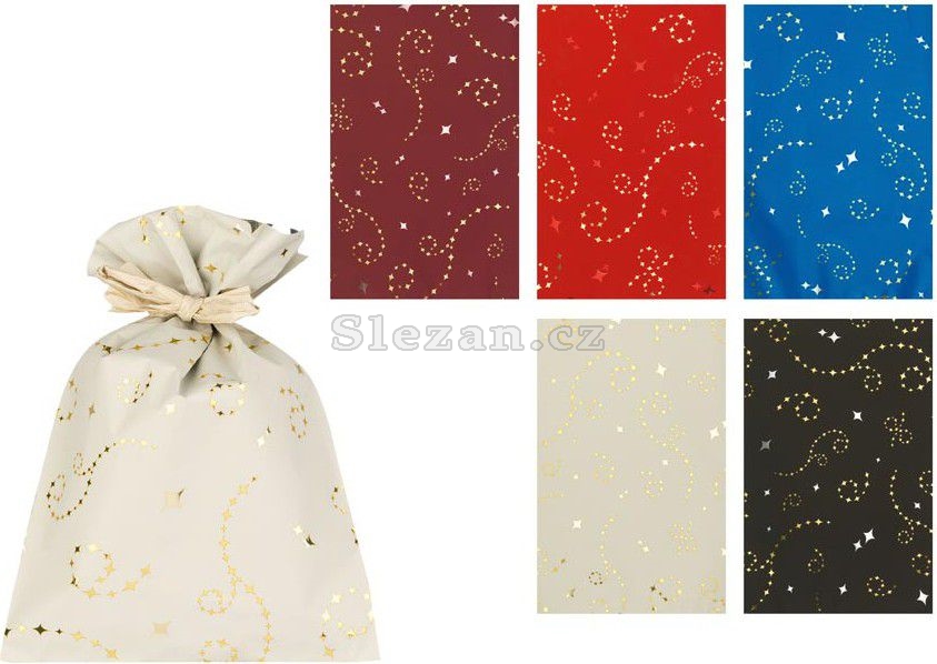 Vánoční celofánový sáček s motivem zlatých hvězdiček v mixu barev. Vyrobený z luxusního celofánu s potiskem. Skvělý na zabalení drobných dárků. Sáček můžete uzavřít vázací stuhou a tím ho dozdobit. Motiv: hvězdičky Rozměr: 200 x 350 mm Barva: bordó, červená, modrá, bílá, černá Dodáváme v mixu 5 ks dle skladové zásoby. Uvedená cena je za 1 ks.
