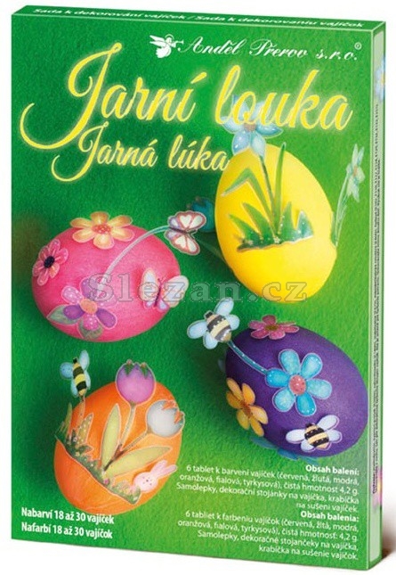 Obsah balení: 6 tablet k obarvení vajíček (červená, žlutá, modrá, oranžová, fialová, tyrkysová), samolepky, dekorační stojánky na vajíčka, krabička na sušení vajíček