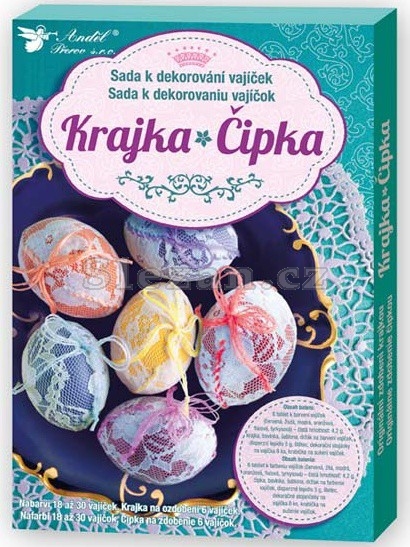 Obsah balení: 6 tablet k barvení vajíček 4,2 g (červená, žlutá, modrá, oranžová, fialová, tyrkysová), krajka, bavlnka, šablona, držák na barvení vajíček, disperzní lepidlo 5 g, štětec, dekorační stojánky na vajíčka 8 ks, krabička na sušení vajíček.