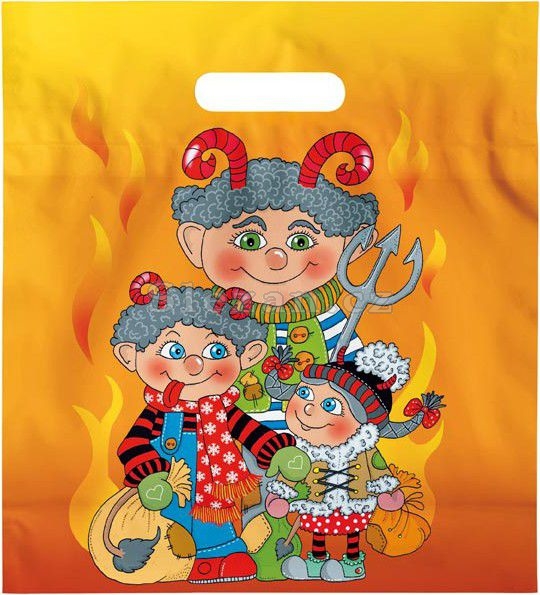 Igelitová taška s průhmatem v Mikulášském motivu, která je ideální na zabalení dobrot, sladkostí a na další mikulášskou nadílku pro děti. Na tašce je obrázek tří čertů.