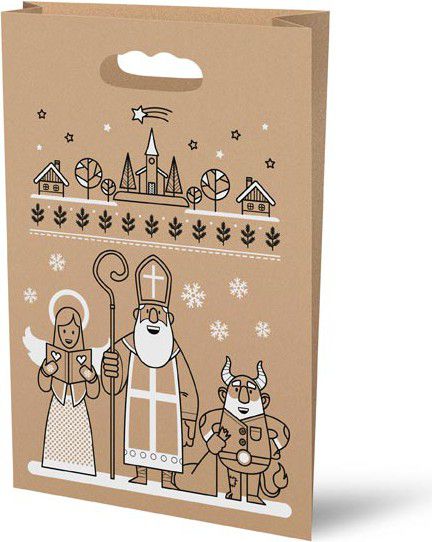Dárková papírová taška s průhmatem a černobílým potiskem Mikuláše, anděla a čerta. Ideální na vytváření čokoládových balíčků pro děti!