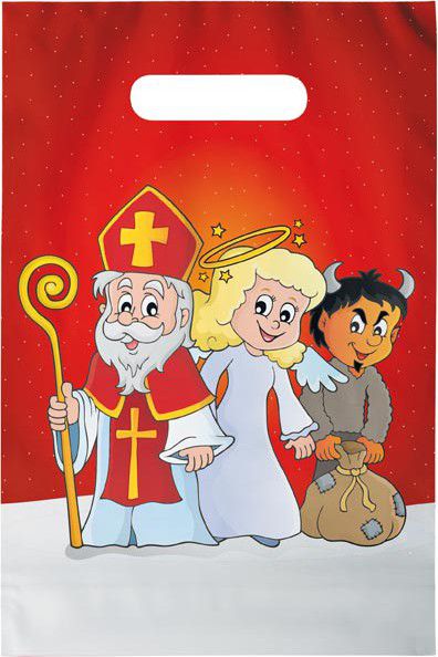 Taška s motivem Mikuláše vyrobená z PVC s průhmatem, která je ideální na zabalení dobrot, sladkostí a na další mikulášskou nadílku pro děti.
