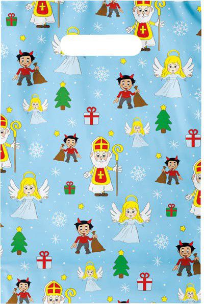 Igelitová taška s průhmatem v Mikulášském motivu. Na tašce je obrázek Mikuláše, anděla, čerta a vánočních dárků. Ideální na zabalení dobrot, sladkostí a na další mikulášskou nadílku pro děti.
