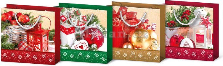 Papírová dárková taška T0 s vánočními motivy. Taška má pevné ucho pro snadné přenášení a štítek pro vepsání jména či přání.