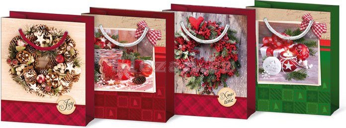 Papírová dárková taška T1 s vánočními motivy. Taška má pevné ucho pro snadné přenášení a štítek pro vepsání jména či přání.