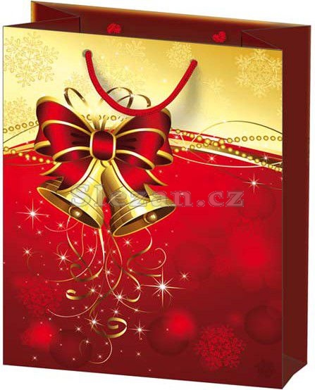 Papírová dárková taška T10 s vánočními motivy. Taška má pevné ucho pro snadné přenášení a štítek pro vepsání jména či přání.