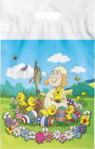 Igelitová taška s průhmatem s velikonočním motivem kraslic a beránka s pomlázkou - Ideální pro vytváření čokoládových balíčků pro děti! Materiál: Polyethylen Tloušťka materiálu: 0,045 my Tisk: 4+0cmyk