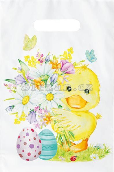 Igelitová taška s průhmatem s velikonočním motivem kraslic, kachňátka a květin. Ideální pro vytváření čokoládových balíčků pro děti! Tisk: 4+0 cm. Materiál: Polyethylen Rozměr: 200 x 300 x 80 mm. Tloušťka materiálu: 0,045 my Uvedená cena je za 1 ks.