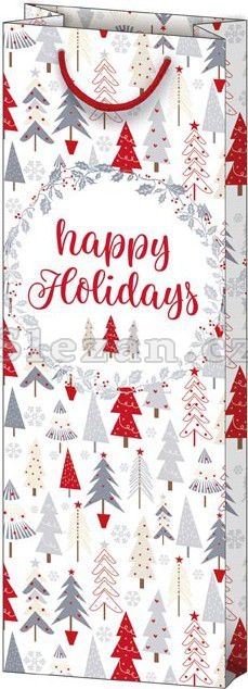 Vánoční dárková papírová taška s motivem stromečků na víno nebo jinou lahvinku. Taška je opatřena pevným uchem pro snadné nošení. Pokud nemáte čas balit dárek do dárkového balícího papíru, tak právě pro Vás máme široký výběr dárkových tašek.
