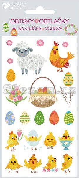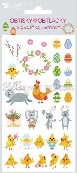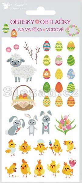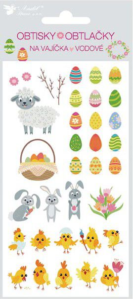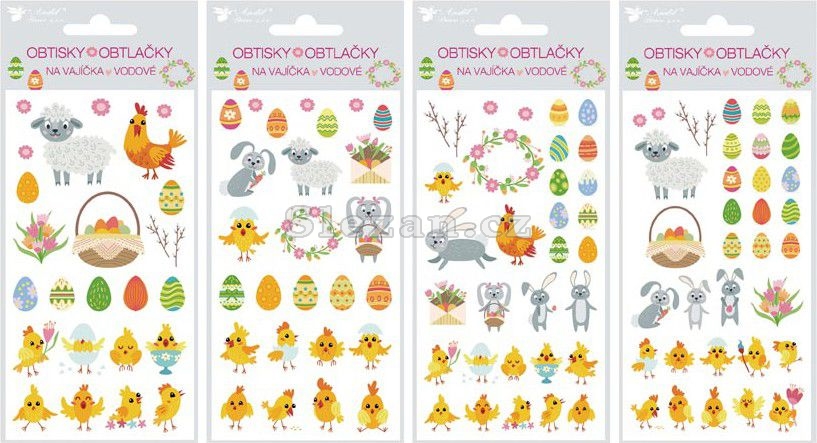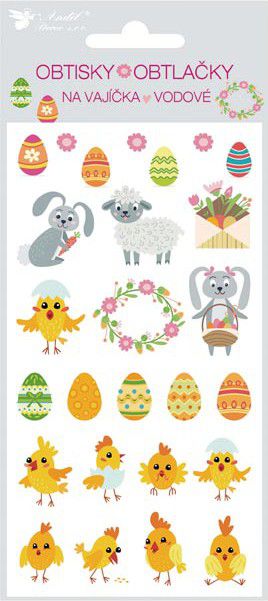 Obtisky na velikonoční vajíčka s klasickými velikonočními motivy jsou krásnou a tradiční technologií zdobení velikonočních vajíček. NÁVOD: Obtisk ponořte na několik vteřin do teplé vody, vyjměte a položte tiskem nahoru na hladkou desku. Jakmile jde obtiskem posouvat, přiložte papír s obtiskem na vařené vajíčko (i obarvené) obrázkem nahoru, papír zpod obtisku vytáhněte a hlazením hladkoou stranou mokrého papíru vymáčkněte vodu a vzduchové bubliny. Pro docílení lesku potřete vajíčka tukem. Dodáváme v mixu po 4 ks dle skladové zásoby. Cena je za 1 ks aršíku.