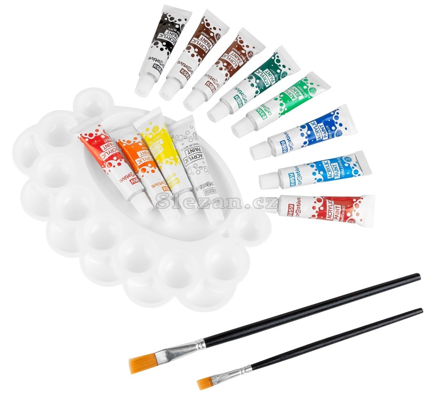 Sada akrylových barev v hliníkové tubě,12 tub, každá o objemu 12 ml, 2 štětce a paleta k míchání barev