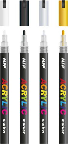 Akrylový popisovač, sada 4 ks balených v plastové krabičce. Tyto akrylové popisovače se vyznačují svou barevnou sytostí i stálostí, a velmi dobrými krycími schopnostmi. Jsou vhodné na všechny nemastné a hladké povrchy, jako jsou plátna, papír, dřevo, kámen atd. Set obsahuje tyto barvy: zlatá, stříbrná, černá, bílá
